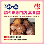 イベント 焼き栗専門店高栗屋 焼き栗専門店「高栗屋」栗を使ったスイーツも沢山準備しております。ぜひお越しください。 開催日時 1月24日(土)~1月31日(土)10:00~20:00 場所 1階 日本一横特設会場 tweetする Facebookでシェアする LINEで送る