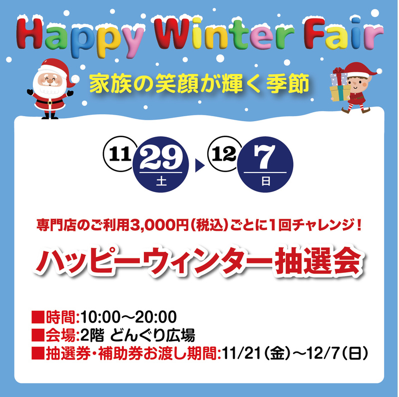 | 開催日時 | 抽選券発行:11/21~12/7 抽選会:11/29~12/7 10時~20時 |