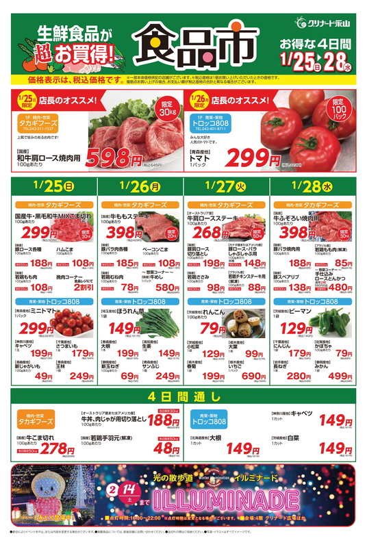 WEBチラシ 食品市1月号 生鮮食品がお買得♪ 季節の美味をお買得価格で! 食卓を彩る生鮮食品やお惣菜、お菓子にお茶もお買得!ぜひ、ご利用ください。 開催日時 1月25日(日)~28日(水) WEBチラシはコチラ tweetする Facebookでシェアする LINEで送る