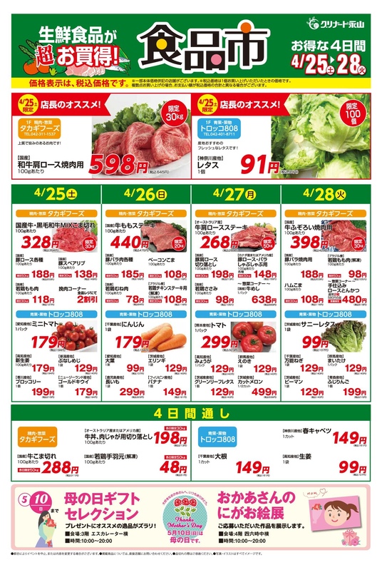 WEBチラシ 4月食品市 生鮮食品がお買得♪ 季節の美味をお買得価格で! 食卓を彩る生鮮食品やお惣菜、お菓子にお茶もお買得!ぜひ、ご利用ください。 開催日時 4月25日(土) ~ 28日(火) WEBチラシはコチラ tweetする Facebookでシェアする LINEで送る