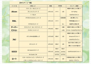 現在実施中のコンタクトレンズご購入時のキャンペーンをお知らせいたします。・アルコン春の新生活応援キャンペーン・B&Lアクアロックスプレゼントキャンペーン・J&Jオアシスシリーズ・MAX乱視用・SEEDAirGradeシリーズご購入キャンペーン ・クーパービジョン春のはじめてキャンペーン・ロートQUOカードプレゼントキャンペーン