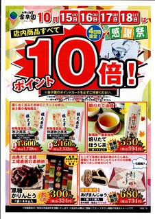 10月15日(水)16日(木)17日(金)18日(土)は 店内商品すべてポイント10倍! さらに、お買い得商品も数量限定でご用意! ぜひこの機会に足をお運びください。 ※金子園のポイントカードを必ずご持参ください。 ※会計後のポイント付与は出来ませんので会計前にご提示ください。