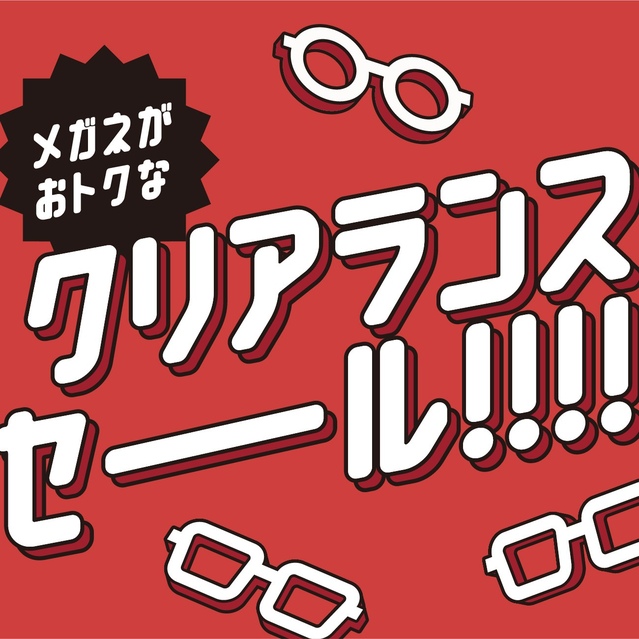 店頭にてクリアランスセールを開催中! メガネ1本目 4,400円(税抜4000円)~ メガネ2本目以降全品《50%OFF!!》 2,200円(税抜2000円)~ (フレーム・薄型標準レンズ・ケース込み) ●2本目割引きのセールはご本人様以外にも、ご家族・お友達・お連れ様と一緒にご利用いただけます! 全て税込価格。 2本目割引は価格がお安い方が対象となります。 オプションレンズは別途料金いただいております。 セールは予告なく終了する場合がございます。