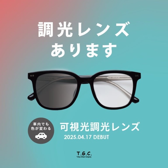 ●可視光調光レンズとは? 従来の紫外線に加え可視光線(380m~780nm)に反応し レンズのカラーが変化するレンズ。車の中でも光に反応して色が変化します。 ●カラー展開 ブラウン・グレー・グリーン ●販売価格 フレーム価格+税込9,900円(税抜9,000円)