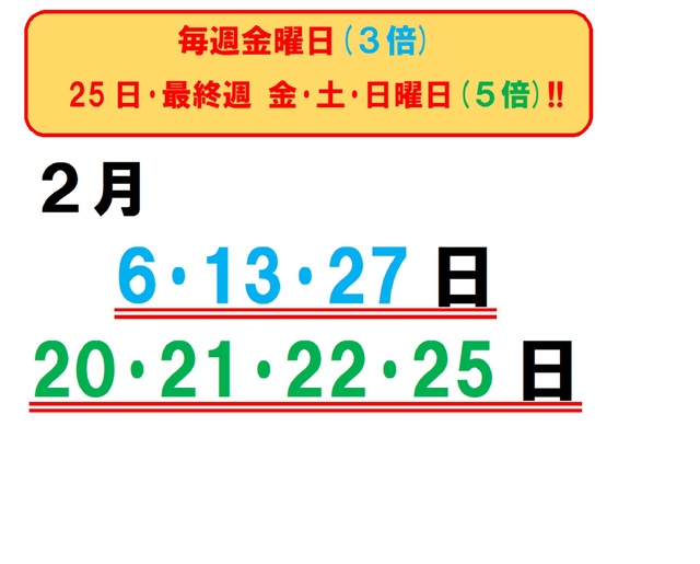 2月のポイントアップデ―のお知らせです 通常100円で1ポイントのところ 上記の日程でポイントアップいたします (一部対象外商品あり) 尚、お支払方法によってはポイントを付けられない 場合があります 詳しくはスタッフにお問合せください